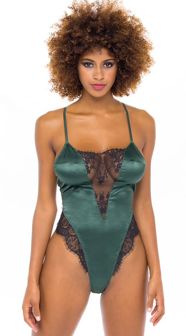 Your babe won’t be able to take their eyes off of you in this alluring teddy featuring soft cups, criss-cross spaghetti straps, a plunging sheer eyelash lace panel, a satin bodice, a back keyhole with a satin tie closure, high cut legs with a scalloped trim, and a thong cut back.