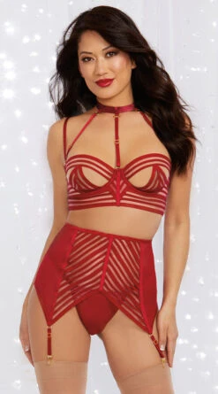 Feel fierce and feminine in this gorgeous bra set featuring semi-open striped underwire cups, adjustable spaghetti straps, a harness neckline with gold O-ring accents, a hook and eye back closure, a matching garter skirt with adjustable garter straps, and a matching g-string panty. (Stockings not included.)