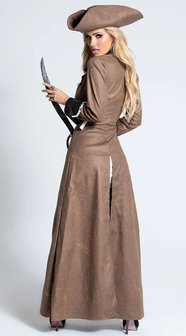 Sail the high seas in this four piece, Deluxe Pirate Captain costume featuring a soft white mini dress, floor-length brown trench coat with studded black faux leather collar, faux leather cuffs with white ruffle trim, zipper front, high slit back, matching black faux leather belt with stud detail and rhinestone buckle, matching brown pirate hat and long pirate sword. (Boot covers not included.)