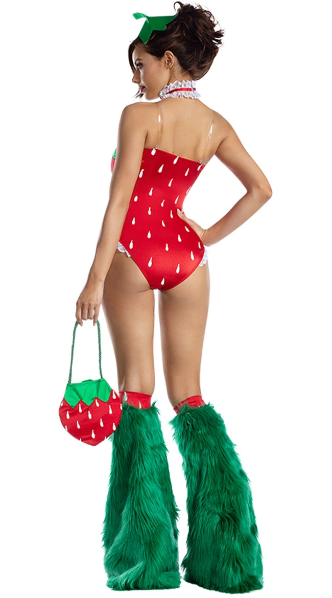 Craving extra juicy sweetness? Be the cutest shortcake in the garden in this Sassy Strawberry costume featuring a red and green strapless romper with white lace trim, daisy accents, furry boot covers, a strawberry purse, and a green leaf headpiece, and a lace choker.