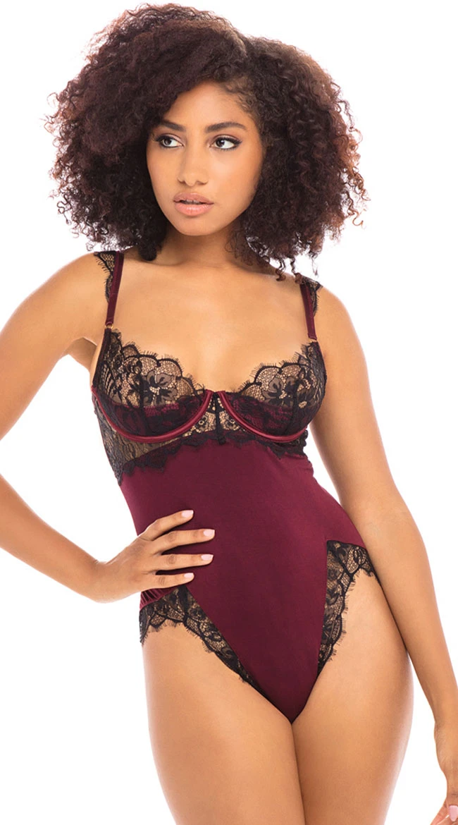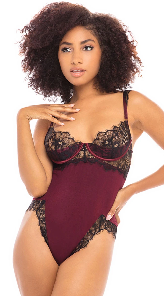 Show him you’re worth waiting for in this sexy teddy featuring red satin underwire demi cups with a gorgeous sheer lace overlay, contrast piping, adjustable spaghetti straps with lace detailing, a smooth solid bodice, high leg slits with a lace trim, a hook and eye back closure with a keyhole, and a cheeky cut back.