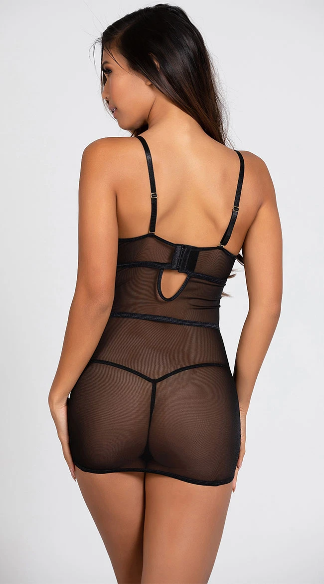 Let your body take shape in this exclusive chemise set featuring removable adjustable spaghetti straps, underwire lace cups, satin channeling, a sheer mesh and lace bodice, a hook and eye back closure, a back keyhole cut-out, removable adjustable garter straps, and a matching thong.